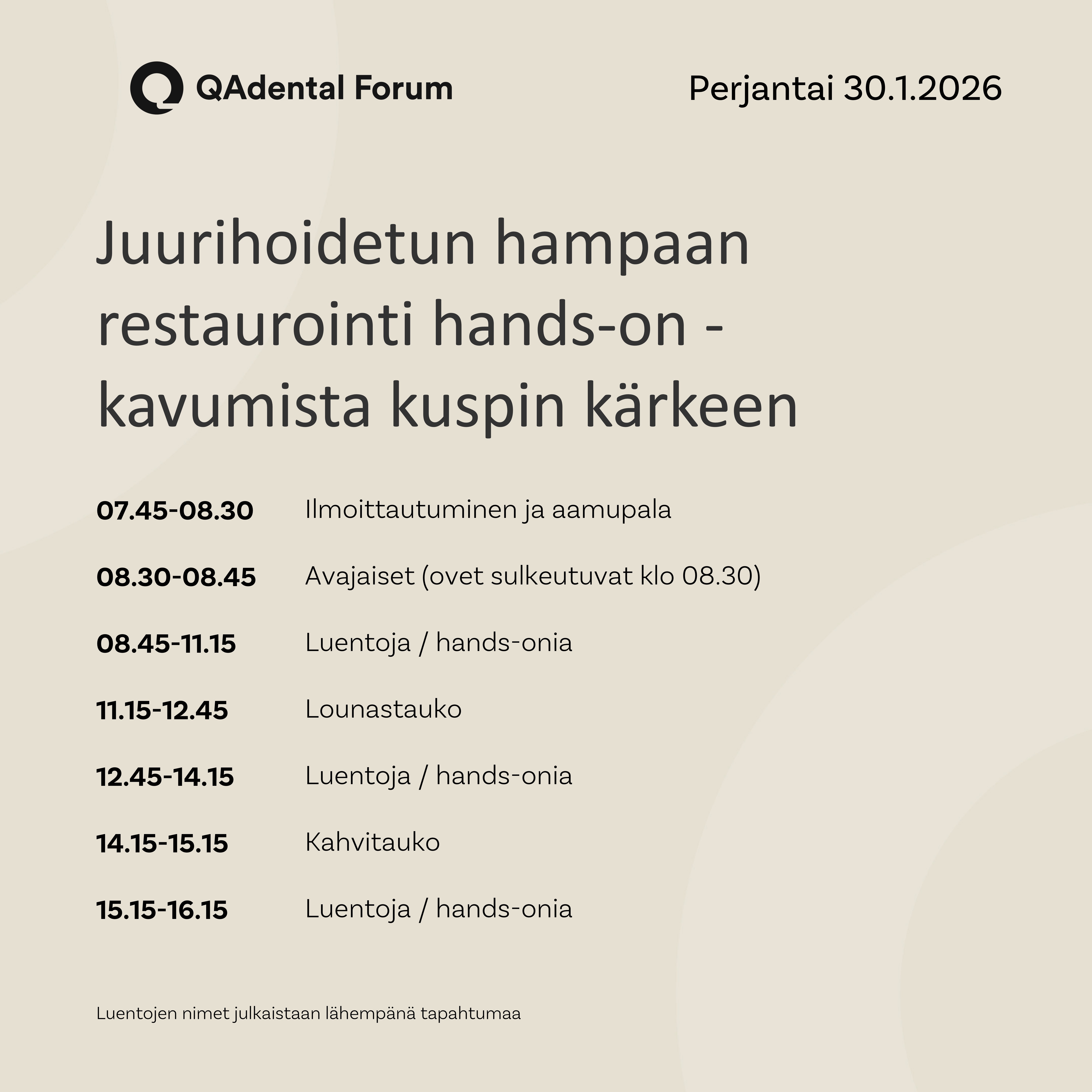Juurihoidetun hampaan restaurointi hands-on - kavumista kuspin kärkeen - QAdental Forum 2026 - erikoisteema 30.1.2026