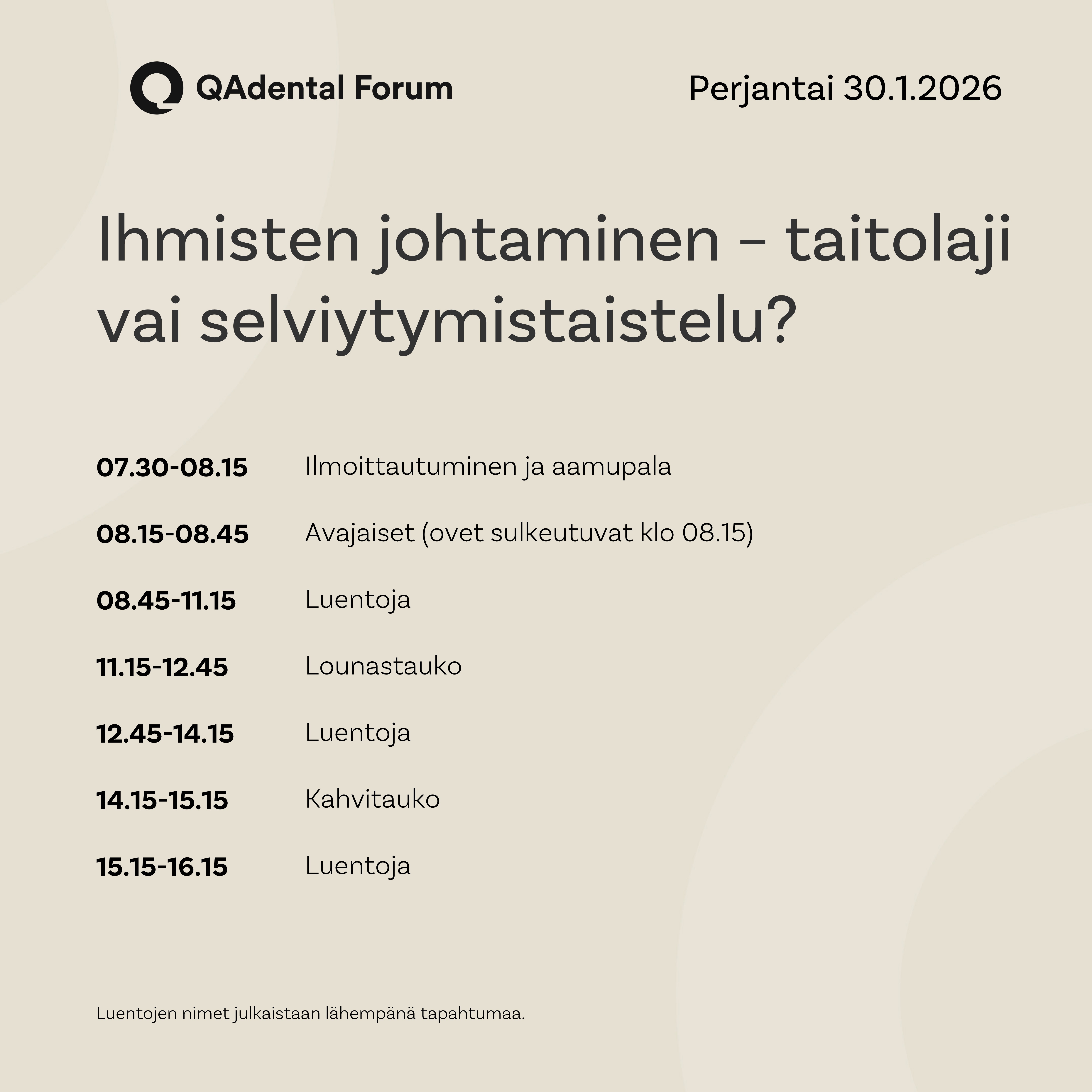 LISÄPAIKKOJA AVATTU: Ihmisten johtaminen - taitolaji vai selviytymistaistelu - QAdental Forum 2026 - erikoisteema 30.1.2026