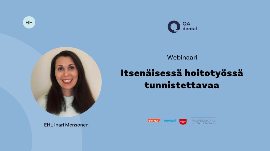 Webinaarisarjan Hammashoitajan itsenäinen hoitotyö ensimmäisellä luennolla lasten hammashoidon erikoishammaslääkäri Inari Mensonen esittelee, minkälaisia riskitekijöitä ja lapsen suusairauksia on tärkeä tunnistaa sekä milloin lapsi tulisi ohjata hammaslääkärin vastaanotolle. Tarkemmin perehdytään karieksen, hampaan kehityshäiriöiden, kriittisten purentavirheiden sekä kiinnityskudossairauksien tunnistamiseen. Lisäksi käsitellään suun tutkimus- ja terveystarkastusvälin määrittämistä ja työnjakoa tiimin välillä sekä sitä, miten lapsen yleisterveys tulisi huomioida tarkastusväliä määritettäessä.
