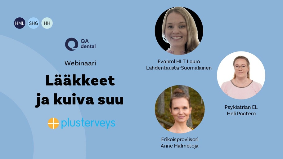 Webinaari pidettiin 19.12.2025. Kyseessä on webinaarisarjan Kuiva suu – moniammatillinen näkökulma toinen luento. Luento on keskustelumuotoinen, jossa evahml HLT Laura Lahdentausta-Suomalainen haastattelee psykiatrian erikoislääkäri Heli Paateroa ja erikoisproviisori Anne Halmetojaa. Lääkkeet ovat merkittävä kuivaa suuta aiheuttava tekijä. Tässä moniammatillisessa keskustelussa syvennetään näkökulmaa lääkkeisiin ja mitä hammashoidossa olisi niistä hyvä tietää koskien kuivaa suuta.